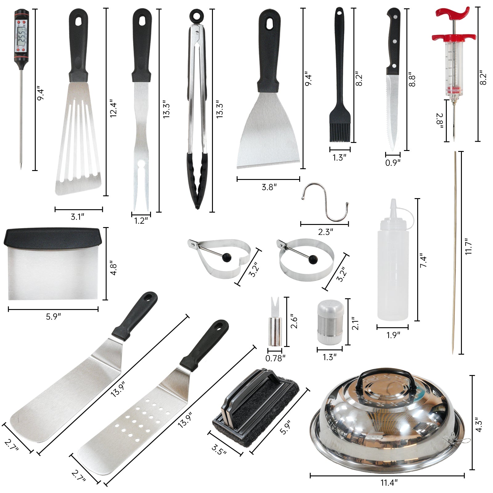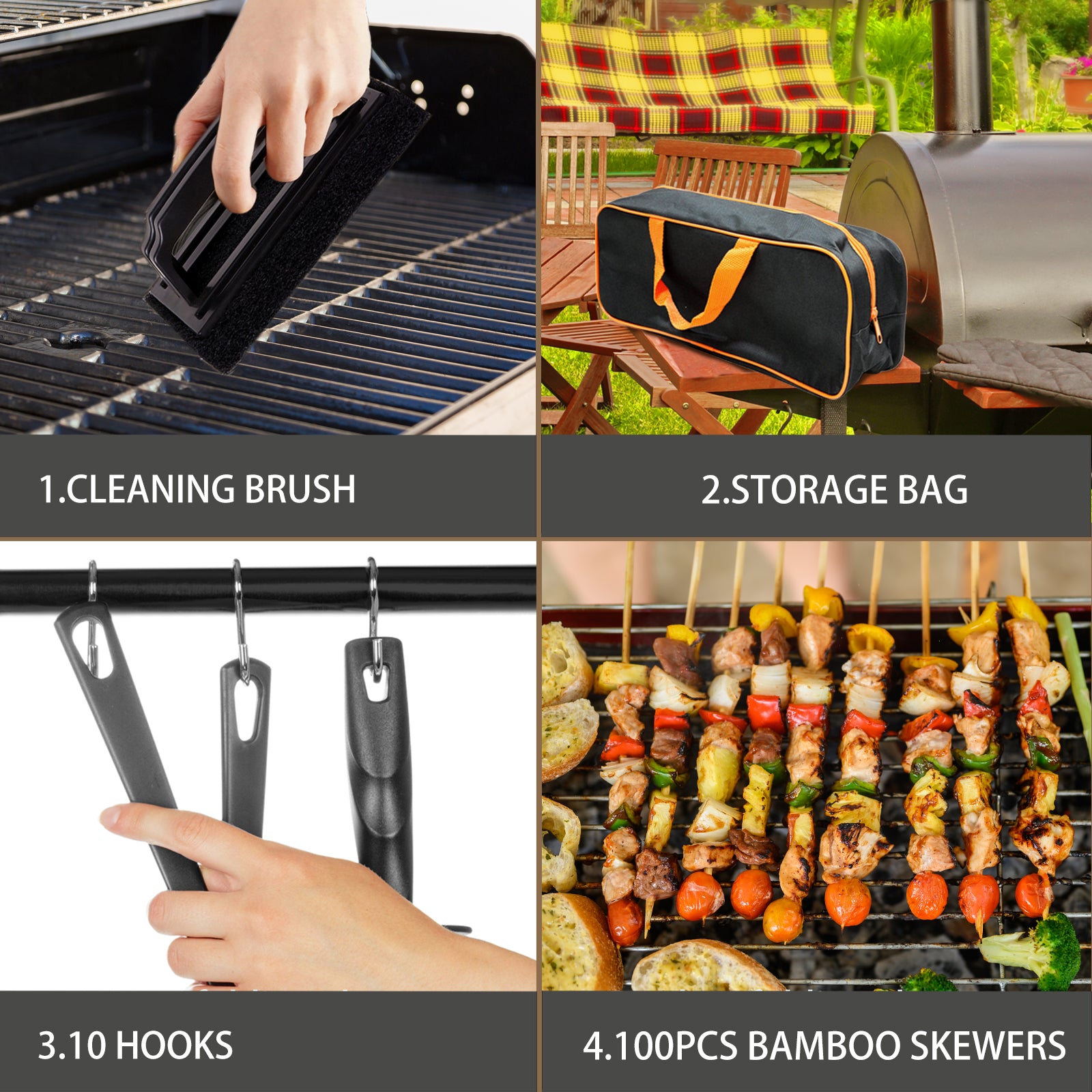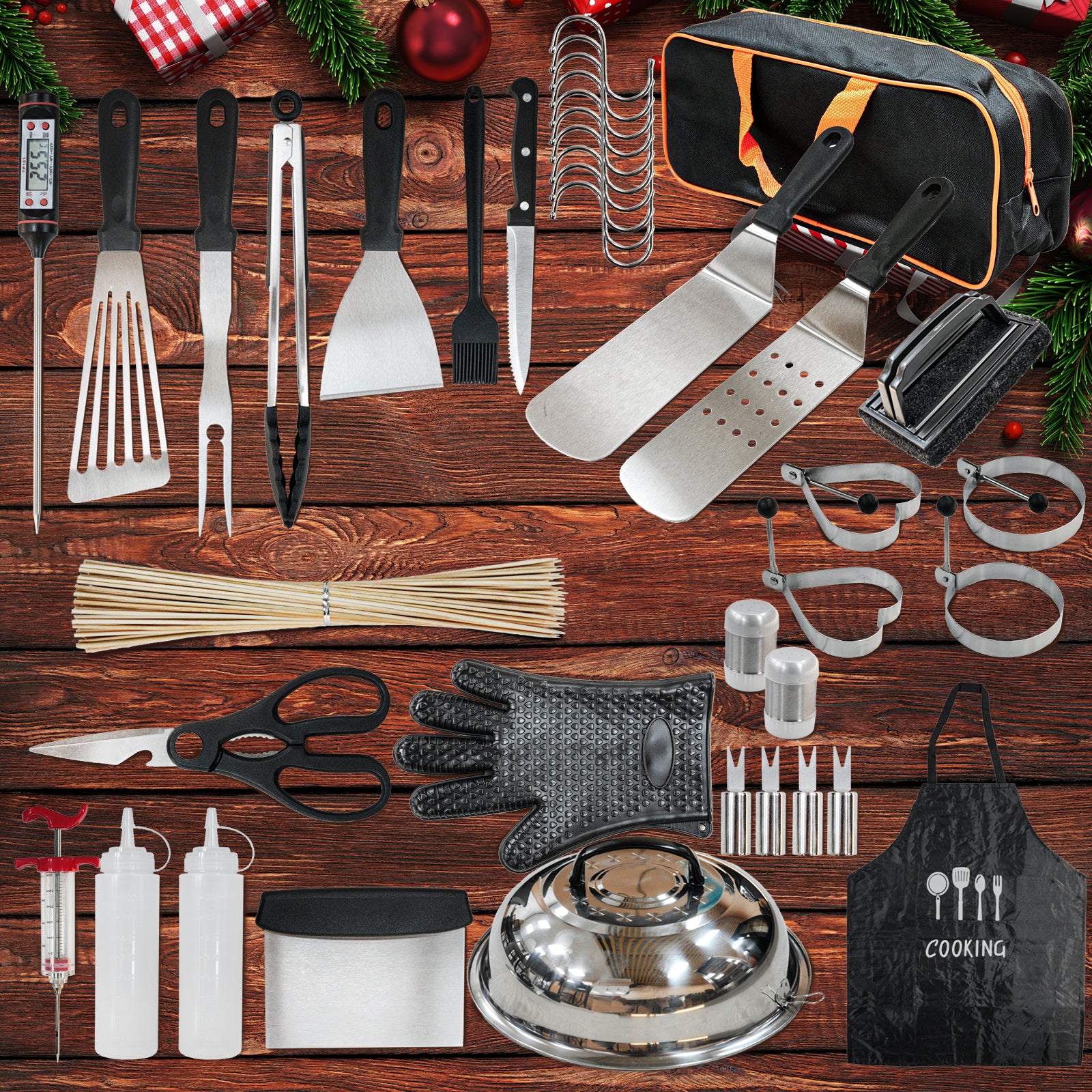 1 x Spatula; 1 x Slotted spatula; 1 x Basting cover; 1 x Grill tongs; 1 x Grill fork; 1 x Meat knife; 1 x Basting brush; 1 x Fish turner; 1 x Chopper, scraper; 2 x Sauce dispenser(16oz); 4 x Egg rings; 2 x Spice shaker; 1 x Scissors; 1 x Silicone gloves; 1 x Meat thermometer; 1 x Meat injector; 1 x Apron; 1 x Cleaning Brush; 1 x Storage bag; 10 x Hooks; 100 x Bamboo skewers.