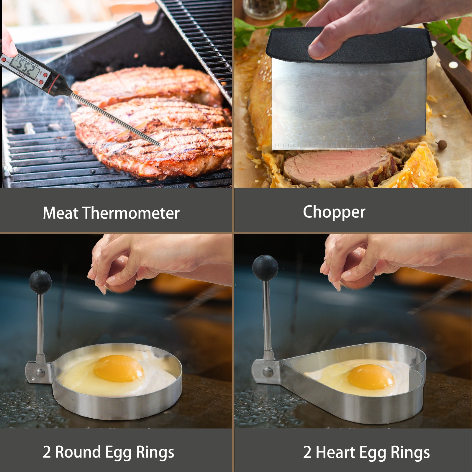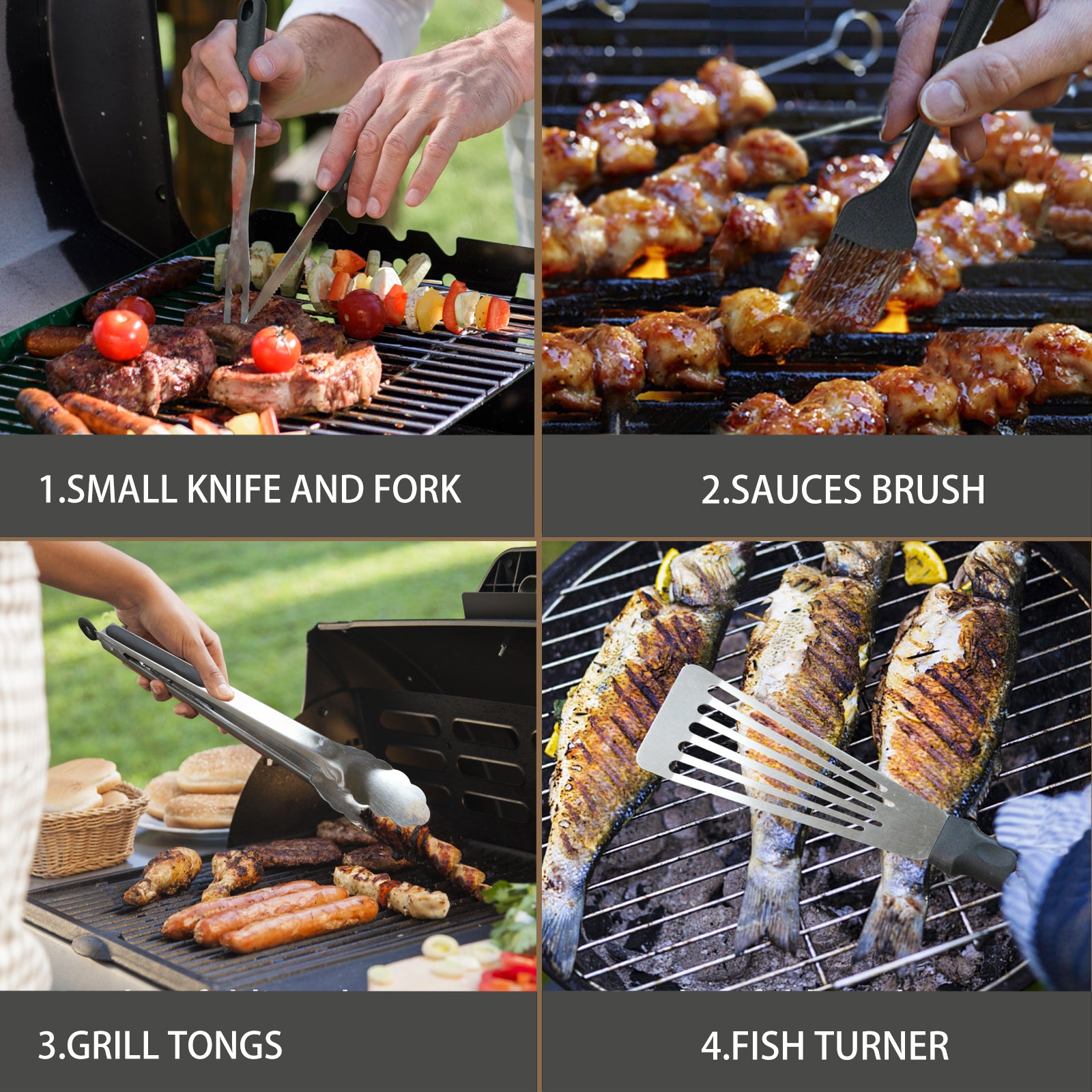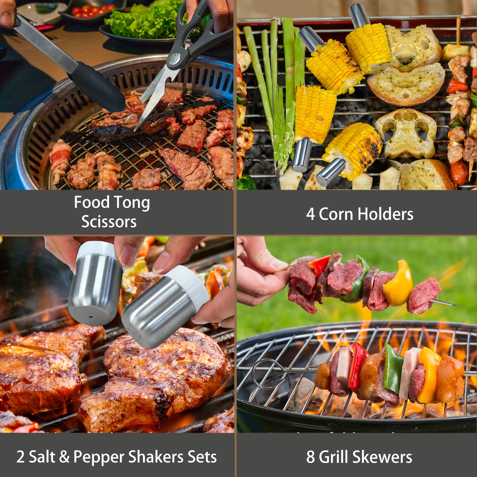 1 x Spatula; 1 x Slotted spatula; 1 x Basting cover; 1 x Grill tongs; 1 x Grill fork; 1 x Meat knife; 1 x Basting brush; 1 x Fish turner; 1 x Chopper, scraper; 2 x Sauce dispenser(16oz); 4 x Egg rings; 2 x Spice shaker; 1 x Scissors; 1 x Silicone gloves; 1 x Meat thermometer; 1 x Meat injector; 1 x Apron; 1 x Cleaning Brush; 1 x Storage bag; 10 x Hooks; 100 x Bamboo skewers.