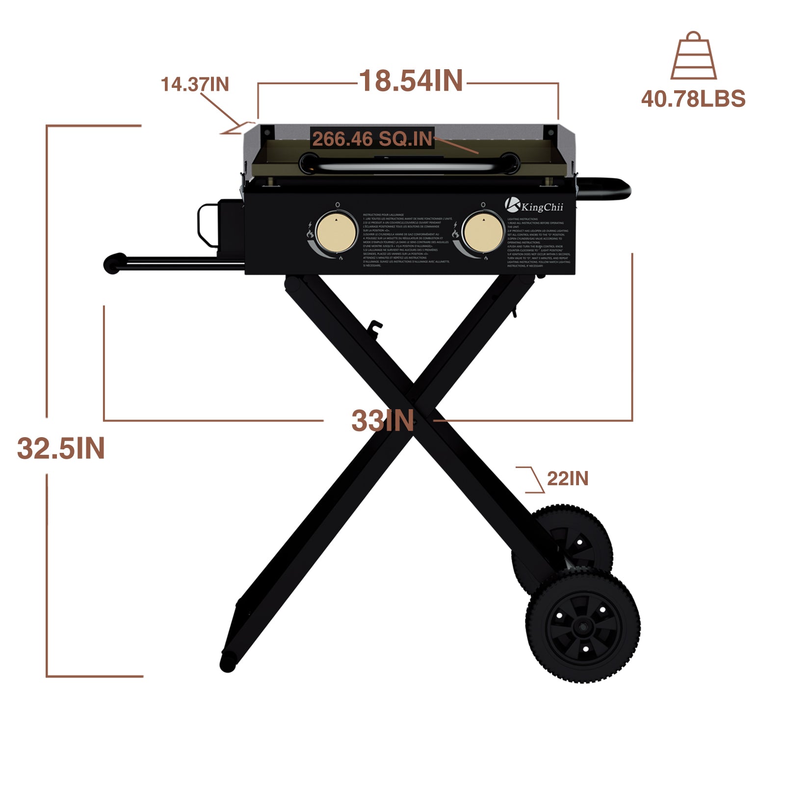 The Kingchii propane griddle, with its 18.5” surface, offers 266 square inches of space. This griddle allows for a wide range of dishes across all meals, from pancakes and grilled cheese to traditional barbecues, ensuring a diverse menu for any time of the day.