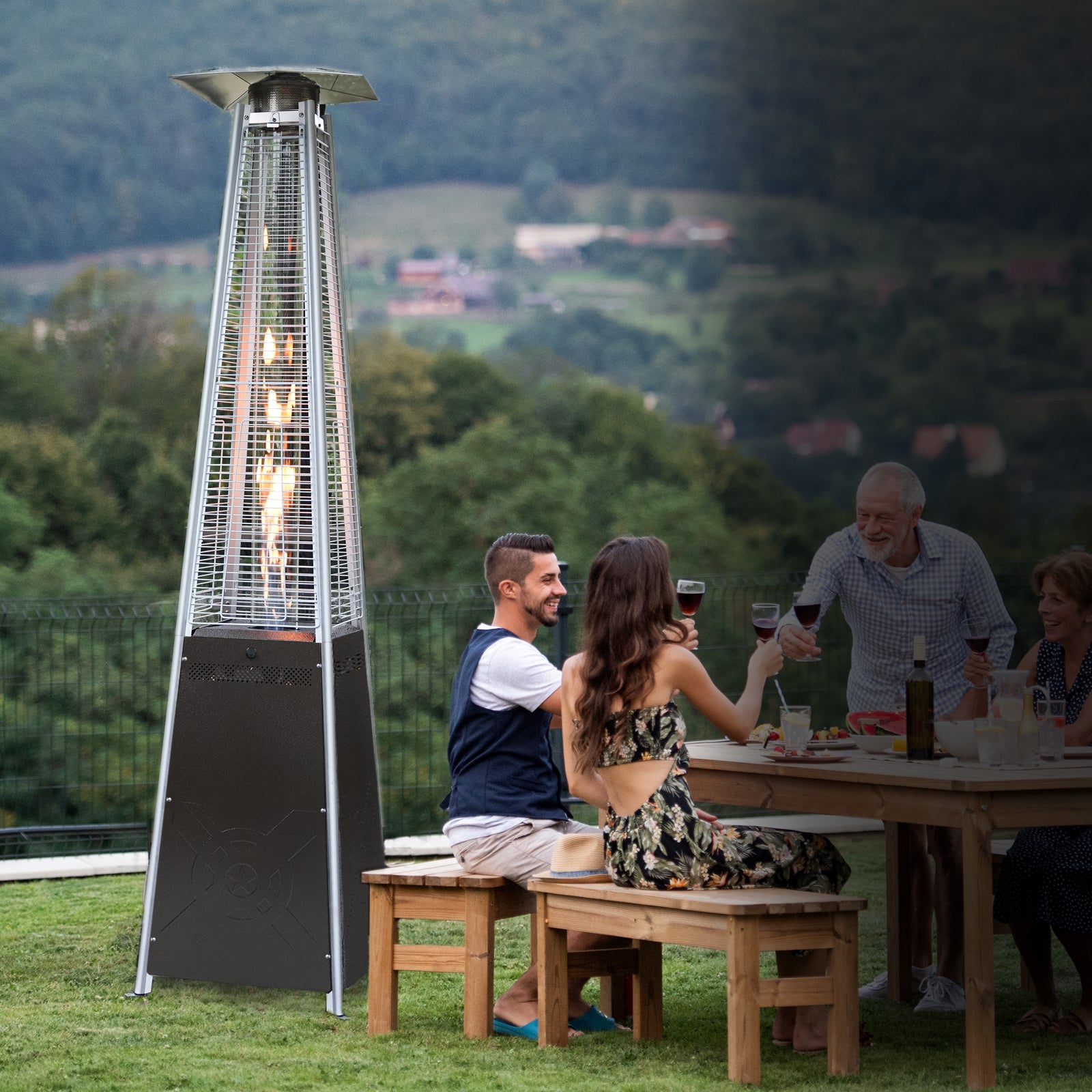 Kingchii Pyramid Patio Heater delivers powerful 48,000 BTU heat output, warming up to 200 sq ft, perfect for patios, backyards, pools, and gardens.