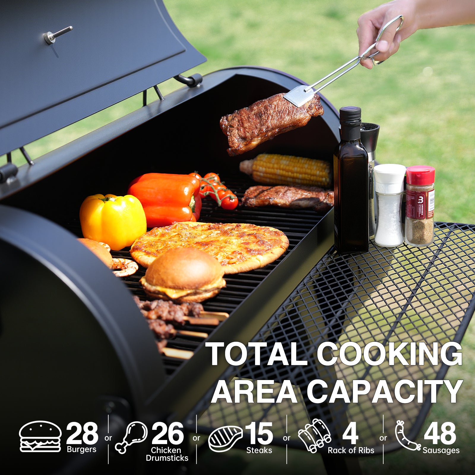 - Grill or smoke up to 20 burgers, 20 chicken drumsticks, 10 steaks, 3 racks of ribs, or 40 sausages at once — featuring 391 sq.in. in the main chamber and 156 sq.in. in the offset firebox.